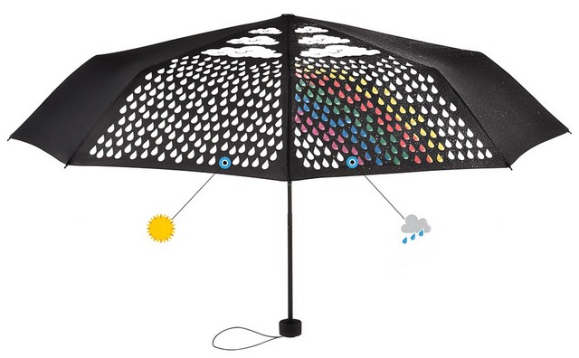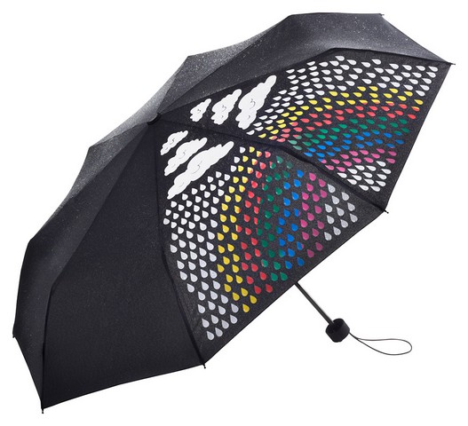 Kolorowy składany parasol z zaskakującą zmianą koloru po zmoczeniu. Z tym oryginalnym mini parasolem zawsze masz asa w rękawie, gdy pada deszcz - lub niespodziankę w kieszeni. Ponieważ gdy tylko otworzysz parasol wilgoć na czaszy ujawnia kolorowy motyw tęczy. Dzięki temu nawet w ponurą pogodę można wydobyć coś fajnego.