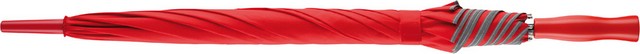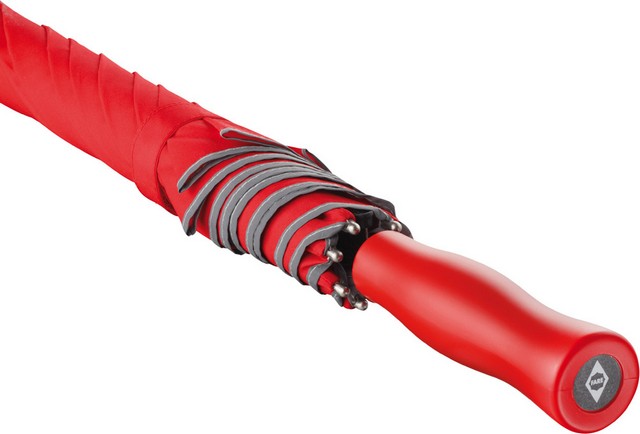 Odblaskowa, srebrna lamówka dla lepszej widoczności w ruchu drogowym. Wysokiej jakości wiatroodporny stelaż z elastycznego włókna szklanego sprawia, że parasol może wytrzymać gwałtowne podmuchy wiatru. W ekstremalnych sytuacjach wietrznych czasza wywija się na lewą stronę ale żebra nie pękają i nie zginają się. Plastikowa, matowa rączka z możliwością personalizacji - możliwość wklejenia domingu. Solidny 12 mm kij z włókna szklanego. Kolorystyka: biały, czerwony, granayowy, szary, czarny