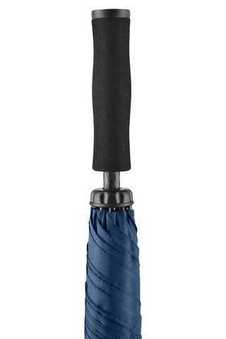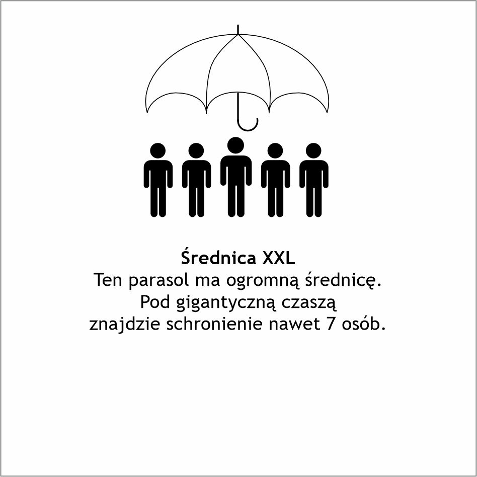 Ogromna czasza parasola może ochronić kilka osób. Wytrzymały 16mm kij z włókna szklanego. Wysokiej jakości wiatroodporny stelaż z elastycznego włókna szklanego sprawia, że parasol może wytrzymać gwałtowne podmuchy wiatru. W ekstremalnych sytuacjach wietrznych czasza wywija się na lewą stronę ale żebra nie pękają i nie zginają się. Otwieranie manualne poprzez bezpieczny suwak. Przyjemna w dotyku, piankowa, prosta rączka z możliwością personalizacji - możliwość wklejenia domingu. Ogromna średnica 180 cm. Kolorystyka: granatowy, czarny