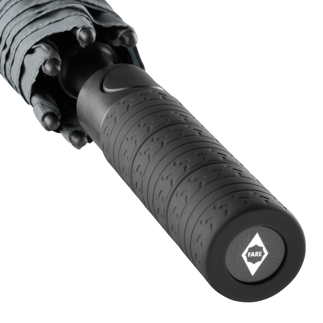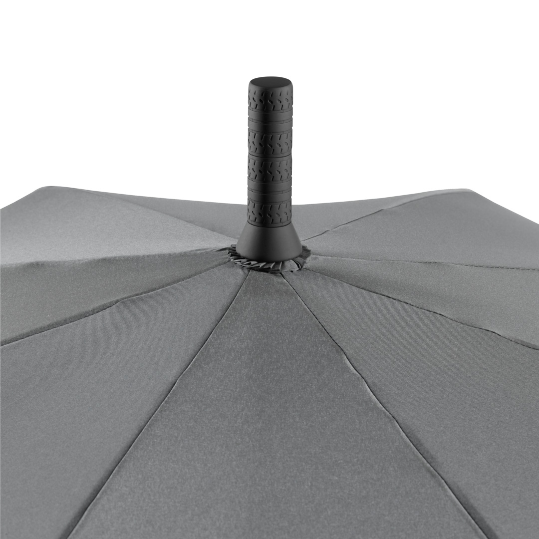 Ekskluzywny automatyczny parasol golfowydla dwóch osób z elementami bieżnika opony Rączka i szpic parasola są wzorowane na profilu opony a jasnoszare spoiny fascynują swoim technicznym wyglądem.
