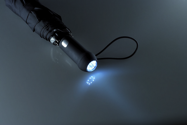 Czasza z odblaskowymi elementami 3M ™ Scotchlite ™ w narożnikach brytów i rączka z ruchomą latarką LED dla optymalnej widoczności w ruchu drogowym. Funkcja z ciągłym światłem białym i migającym czerwonym. Wygodna funkcja szybkiego automatycznego otwierania i zamknania. Wysokiej jakości wiatroodporny stelaż z elastycznego włókna szklanego sprawia, że parasol może wytrzymać gwałtowne podmuchy wiatru. W ekstremalnych sytuacjach wietrznych czasza wywija się na lewą stronę ale żebra nie pękają i nie zginają się. Rączka z możliwością personalizacji - możliwość wklejenia domingu. 3 razy składany. Stalowy kij.
